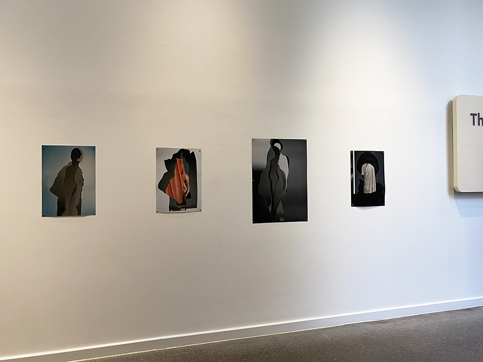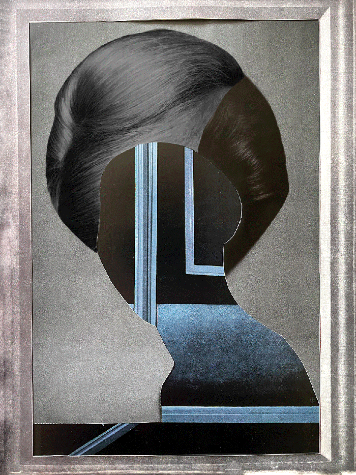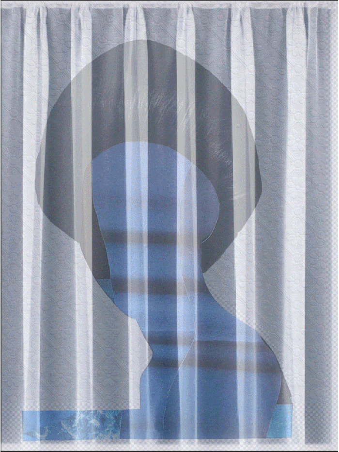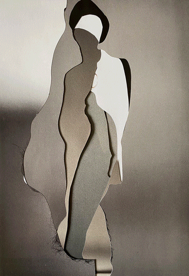 My use of paper and digital collage – an artistic method already associated with disorientation – when merged with the jerky animation caused by the GIF process, makes the original source photographs unfamiliar. Combining different digital and analogue textures and effects suggests uncontrolled slippages and uncanny movements. The five GIFs are all different yet similar motifs, colours and textures repeat and dissolve across all of them – a subtle acknowledgement of the repetition of daily life under lockdown and partial lockdown. The colour palette is subdued, monochrome at times, however the colour blue features most frequently as blue is the colour most associated with liminal states – it is the colour of twilight and also the colour associated with cleanliness and protection – disinfectant bottles, PPE gloves and masks. The recurring silhouette motif alludes to the continual multiplication and dematerialisation of our bodies, as we flit between different physical and virtual spaces and states and protect ourselves behind layers of surfaces and screens.