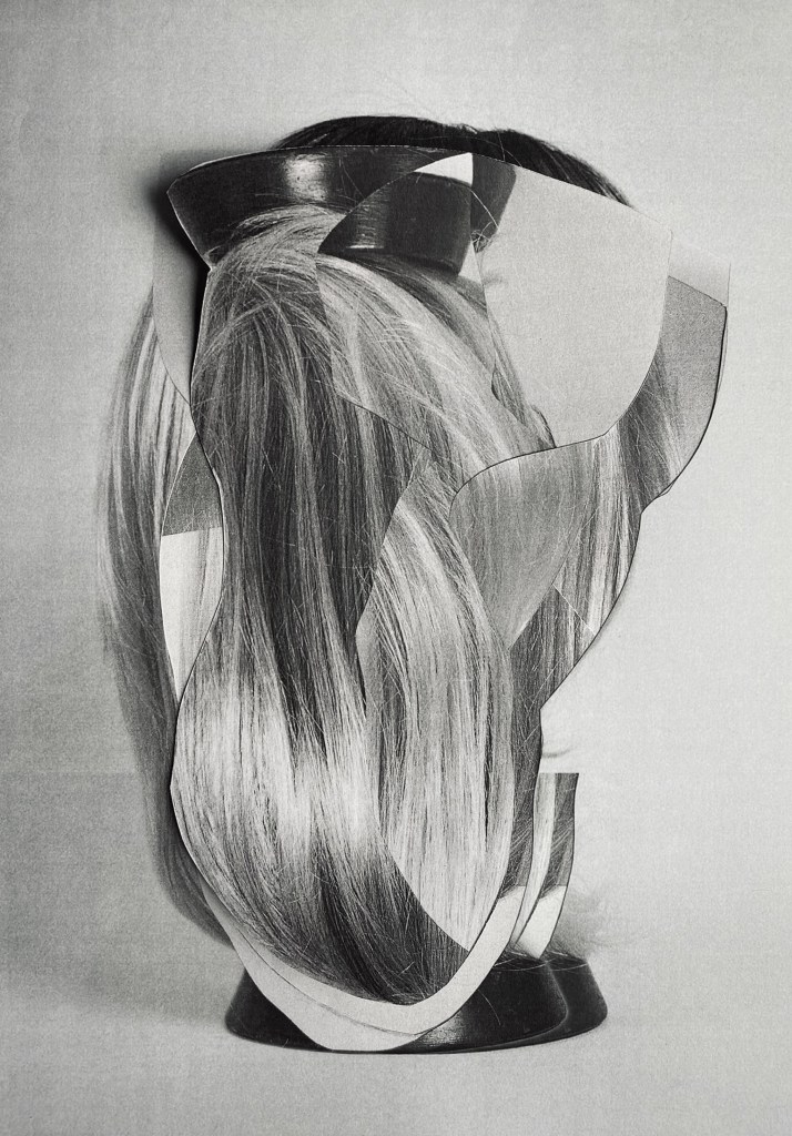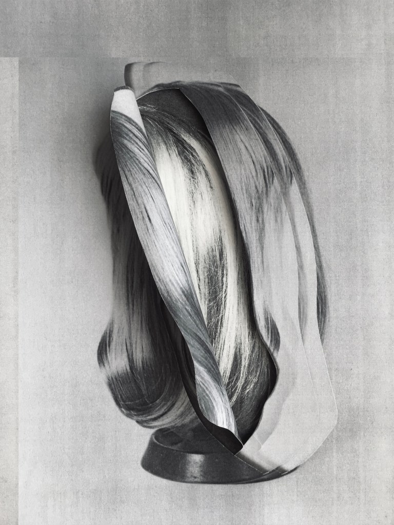Detached from a wearer, they become eerie. Their disembodied nature makes them appear as if they should still be attached to someone. This is particularly emphasized through the forensic-style photography I used in the original pre-collaged photographs, and the series presents wigs as if they were remnants of something lost, something once alive. Wigs are particularly powerful symbols in my work because they embody transformation and instability. Unlike other garments or accessories, wigs exist in a strange in-between state, complicating notions of identity, authenticity, and the body. Wigs are not quite part of the body, yet they are not purely artificial either. They sometimes contain human hair, making them simultaneously organic and manufactured. This contradiction makes them a liminal object, existing between real and fake, animate and inanimate. Wigs highlight how easily appearance can change, underscoring the instability of personal identity. The ability to switch hair (and by extension, persona) in seconds problematizes the boundaries of selfhood, suggesting that identity is just as constructed and mutable as a collage. My technique of cutting and folding photographs of wigs introduces a paradox—by manipulating a flat image, I create an illusion of depth, but one that remains artificial. This plays with the tension between surface and substance, questioning the authenticity of both images and identity. The slippages I introduce suggest that identity is not fixed but continuously reconstituted through objects, surfaces, and representations that never fully resolve.